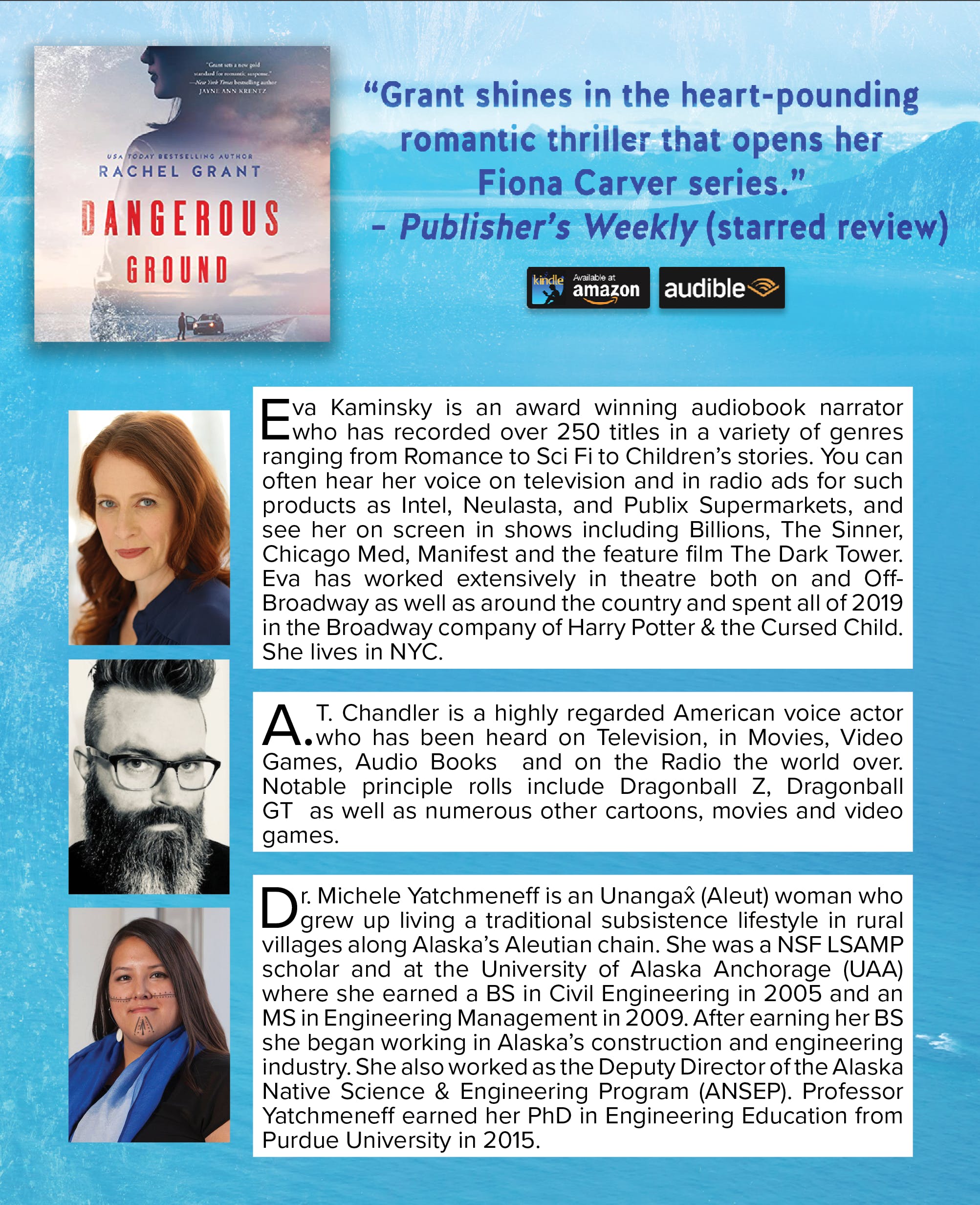 I am so thrilled to share with you that DANGEROUS GROUND has THREE narrators: Eva Kaminsky, A.T. Chandler, and Michele Yatchmeneff. Romance audiobook fans will likely be familiar with Eva Kaminsky and A.T. Chandler (although they might be more familiar with A.T.’s work as Aiden Snow). I’m a huge fan of both narrators and am thrilled they were cast as Fiona and Dean! ?